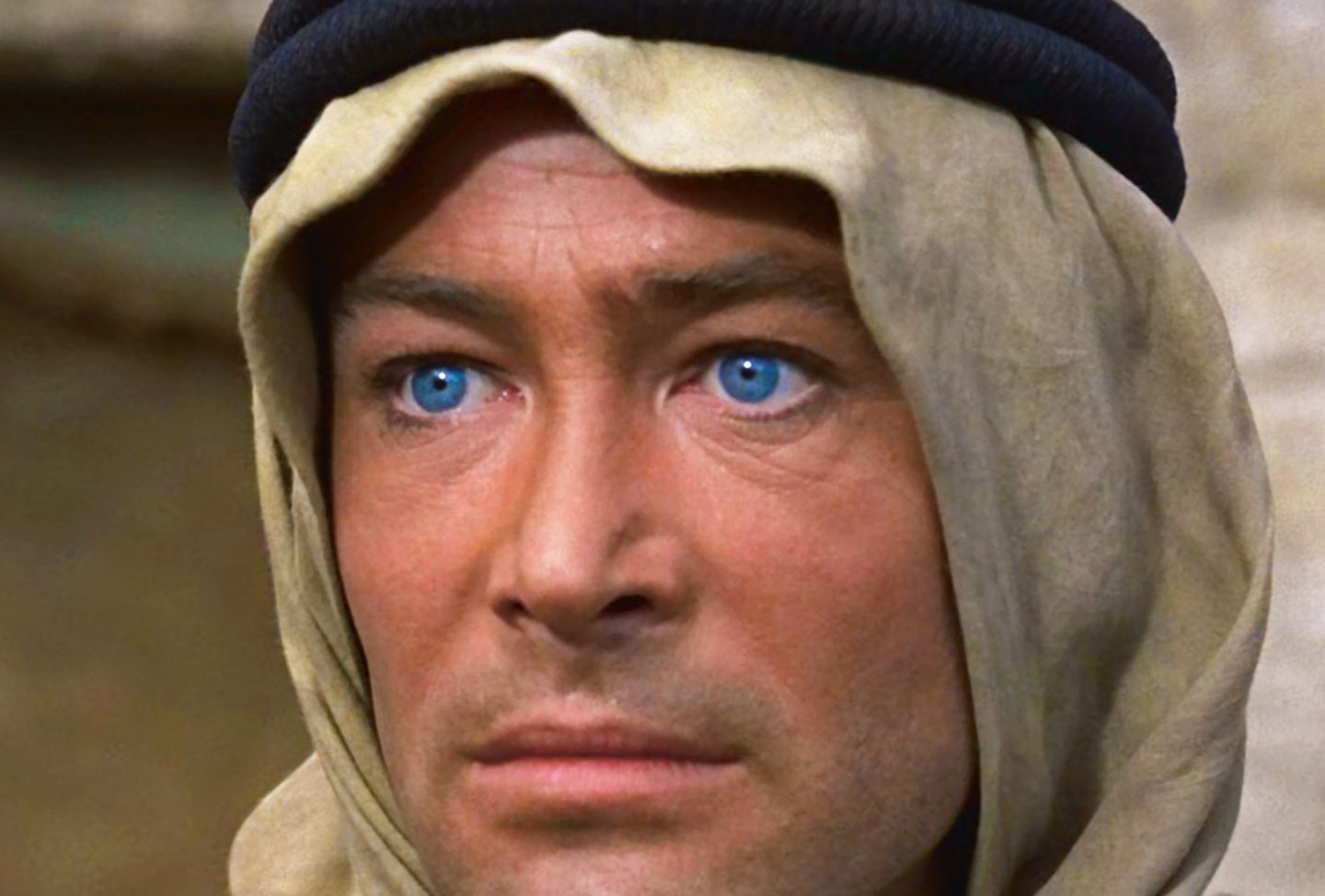 Peter O’Toole as T. E. Lawrence in Lawrence of Arabia (1962), his ‘impossibly blue’ Irish eyes appearing like hydrating oases in the Arabian desert