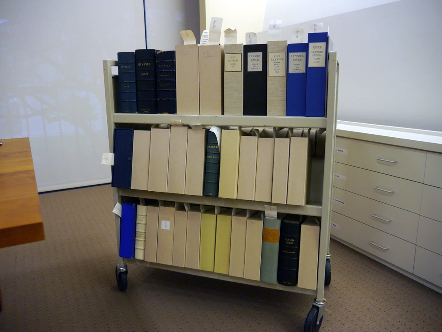 A library trolley holding over 40 copies of the first edition of Ulysses in The Harry Ransom Center at The University of Texas at Austin